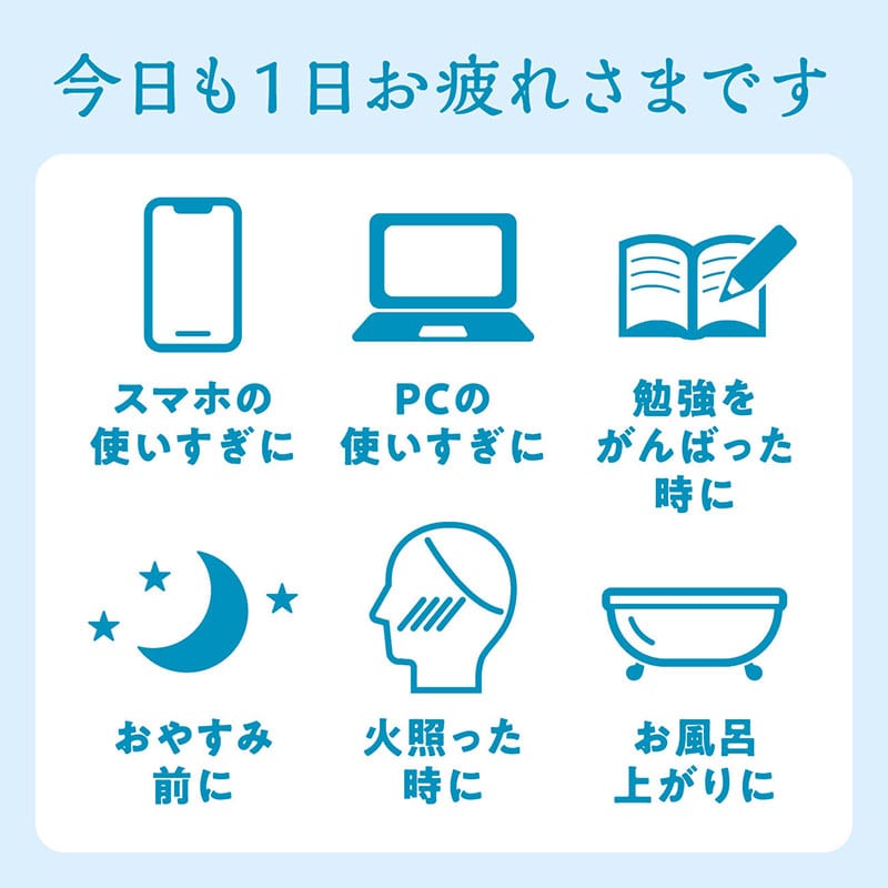 おやすみ前に、天然精油配合の安らぎアロマと清涼成分で目と目元をじんわり涼やかに。やさしい冷涼感と共にリラックスタイムをお過ごしください。PCやスマホを使いすぎた時や仕事の合間、ほっとひと息つきたい時に。