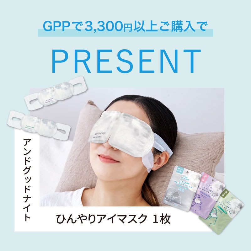 GPPオンラインショップでは、下記の期間、1回のお買い物合計が3,300円(税込)以上で、『アンドグッドナイト ひんやりアイマスク1枚』のいずれかおひとつをプレゼント。