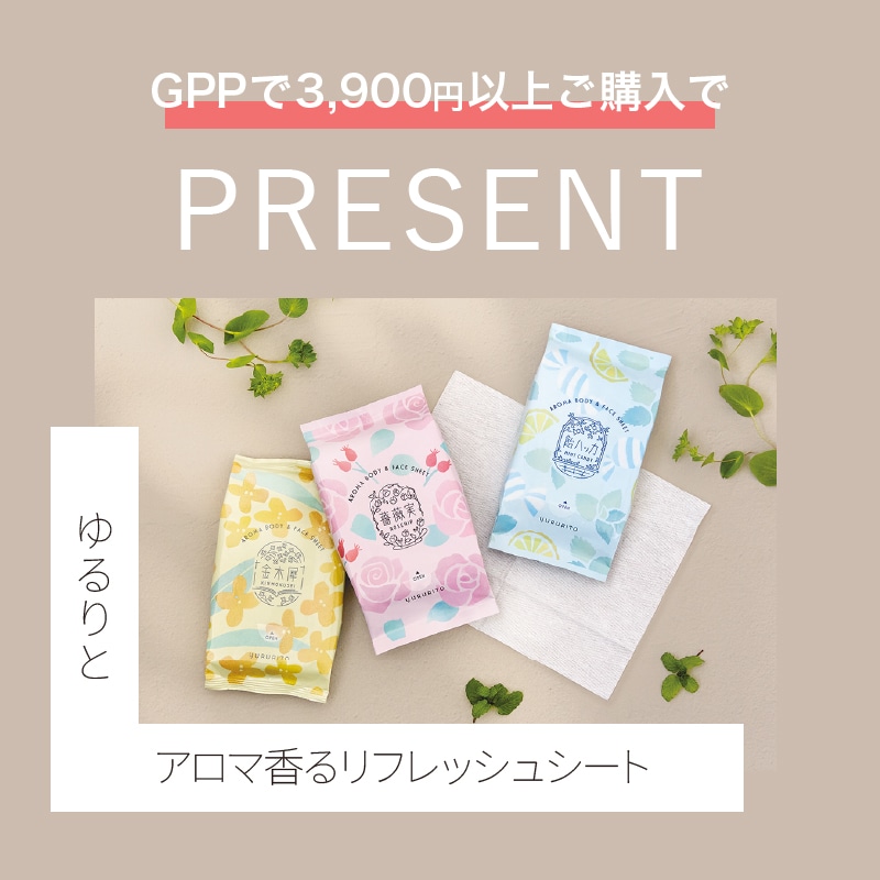GPPオンラインショップでは、下記の期間、1回のお買い物合計が3,900円(税込)以上で、『ゆるりと アロマ香るリフレッシュシート』のいずれかおひとつをプレゼント。