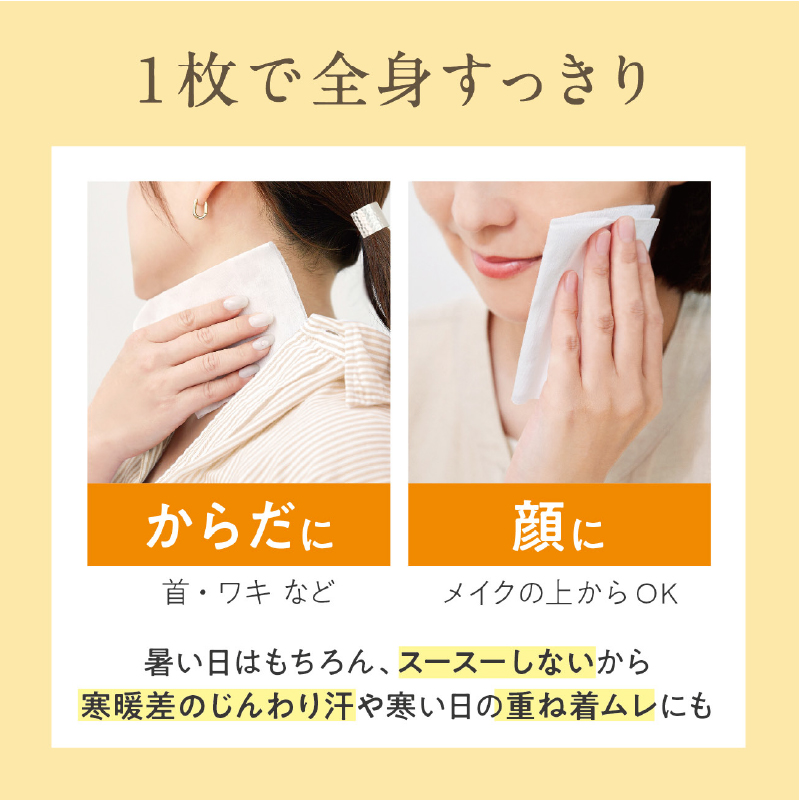 1枚でからだも顔も拭けるボディー&フェイスシート。汗・皮脂を吸着するサラサラパウダー配合。やわらかな厚手シートで、汗やベタつき、気になるニオイをしっかりと拭き取ります。メントール不使用のやさしい使い心地だから親子でお使いいただけます。