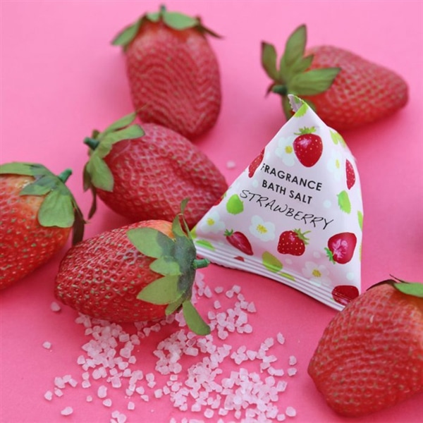 あまずっぱいいちごの香りを楽しむ、使い切りタイプのバスソルト。いつものお風呂をちょっと特別にしたい時におすすめです。