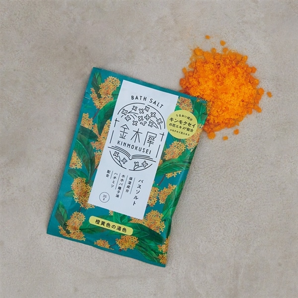 保湿成分のモクセイ花エキス、ホホバ種子油、ハチミツ配合のソルトタイプの入浴料。