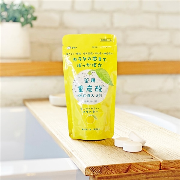 ほんのりゆず香る、タブレット型の重炭酸(*)入浴剤。重炭酸(*)が温浴効果を高めて血行を促進。