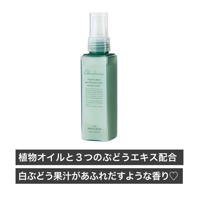 白ぶどう果汁があふれだすような、みずみずしく爽やかなシャルドネの香り。植物オイルと3つのぶどうエキス配合。乾燥が気になる時、リフレッシュしたい時にからだや髪にひと吹きすればみずみずしいアロマに包まれます。