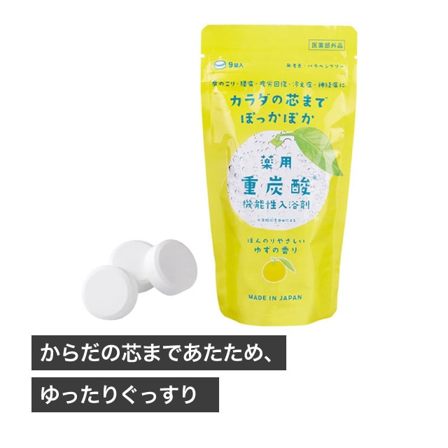 ほんのりゆず香る重炭酸*入浴剤。重炭酸*が温浴効果を高めて血行を促進。からだの芯まであたため、疲労回復・腰痛・肩こり・冷え性のつらい症状をやわらげます。*炭酸水素Naによる