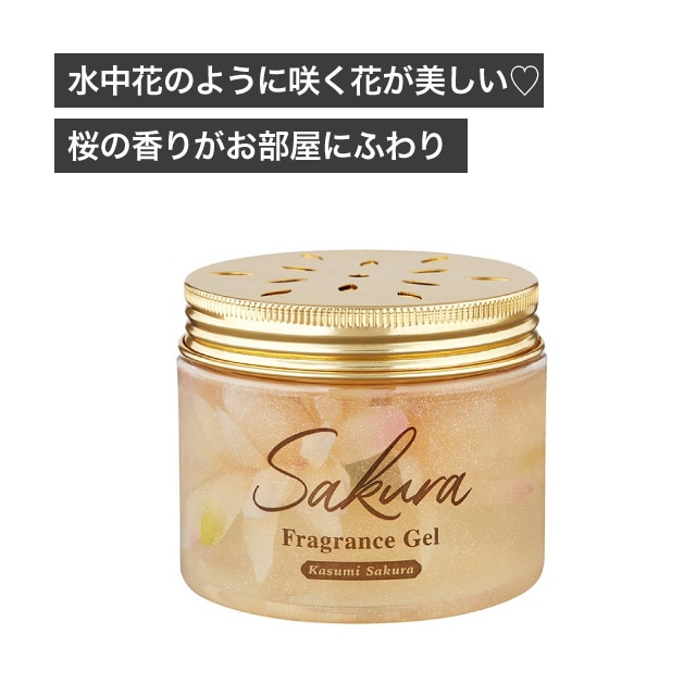 きらめくジェルの中でまるで水中花のように咲く花が目をひく、置き型タイプの芳香剤。使いやすいコンパクトサイズ。淡く愛らしく降りしきるカスミ桜をイメージした可憐でやさしい桜の香りが広がります。