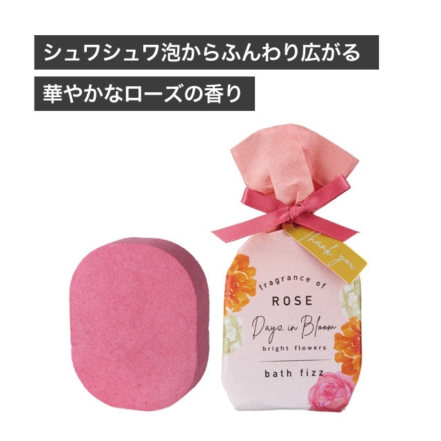 バスルームにやさしい花のアロマ広がる発泡タイプの入浴料。「Thank you」タグ付きでプチギフトにもおすすめ。ふんわり華やかなローズの香り。