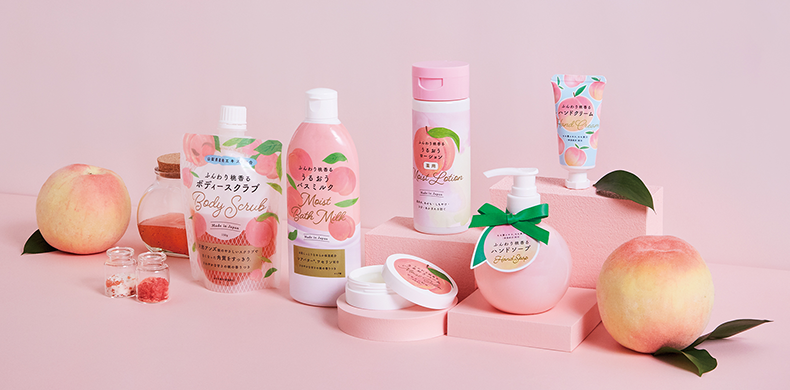 さわやかな甘さの桃の香りに包まれる幸せ。やさしく肌をうるおす、ぷるっと桃肌ボディーケア。