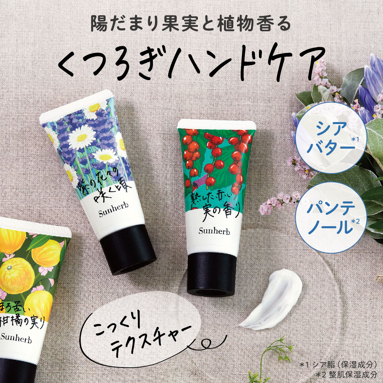 陽だまりの中で見つけた果実や植物の心地よい香りとうるおいで包み込むハンドクリーム。手肌を乾燥から守り、指先までなめらかに。