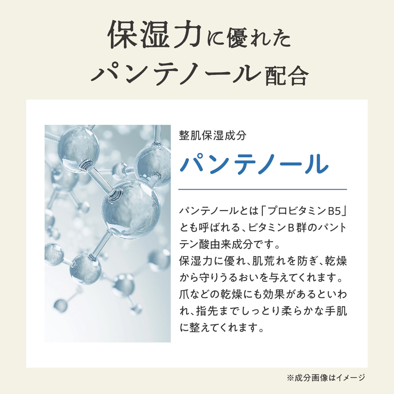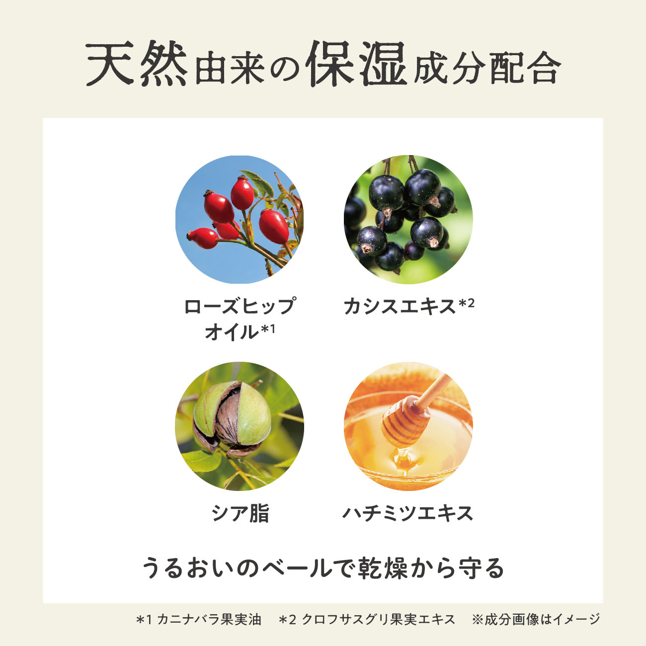 保湿成分:シアバター*1、ハチミツエキス、パンテノール、ローズヒップ油*2、カシスエキス*3配合