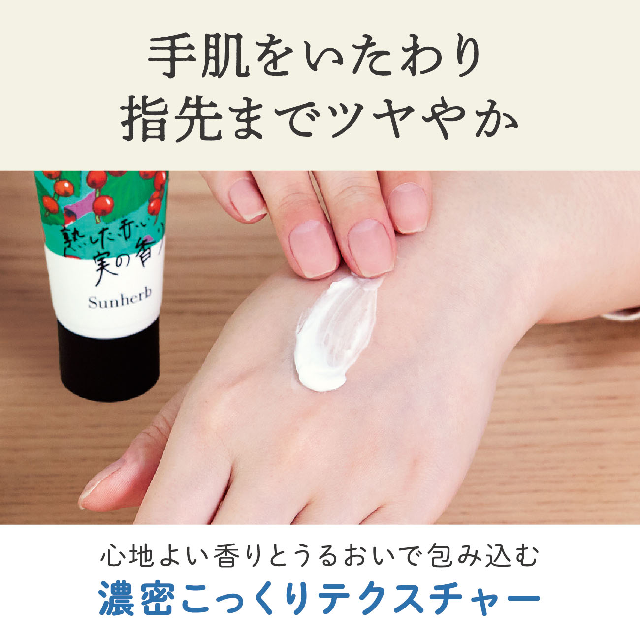 - 陽だまりの中で見つけた果実や植物の心地よい香りとうるおいで包み込むハンドクリーム。手肌を乾燥から守り、指先までなめらかに。