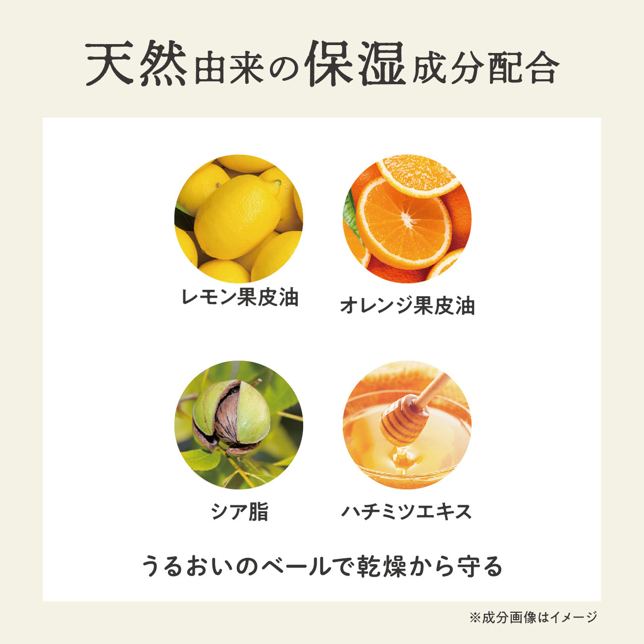 保湿成分:シアバター*1、ハチミツエキス、パンテノール、レモン果皮油、オレンジ果皮油配合