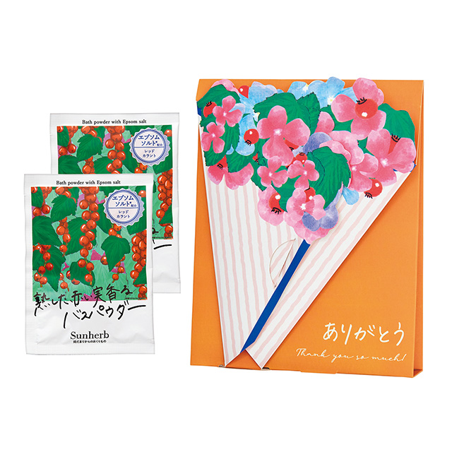 - まるで花束のようなパッケージでバスパウダー2包を包んだメッセージプチギフト。花束は切り取って飾ることもできます。
