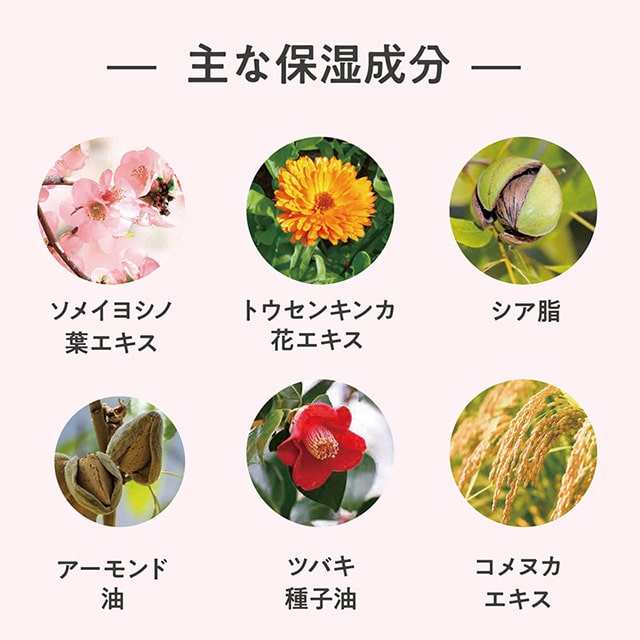 - 水、アーモンド油、セテアリルアルコール、トリ(カプリル酸/カプリン酸)グリセリル、グリセリン、コメヌカ油、ツバキ種子油、アボカド油、シクロメチコン、シア脂、ステアリン酸グリセリル、ステアリン酸PEG-100、香料、酢酸トコフェロール、フェノキシエタノール、ソメイヨシノ葉エキス、トウキンセンカ花エキス、ローズマリーエキス、メドウフォーム種子油、(アクリル酸Na/アクリロイルジメチルタウリンNa)コポリマー、乳酸桿菌/エリオジクチオンカリホルニクム発酵エキス、加水分解コメエキス、酒粕水、クロルフェネシン、3-o-エチルアスコルビン酸、キサンタンガム、ヒアルロン酸Na