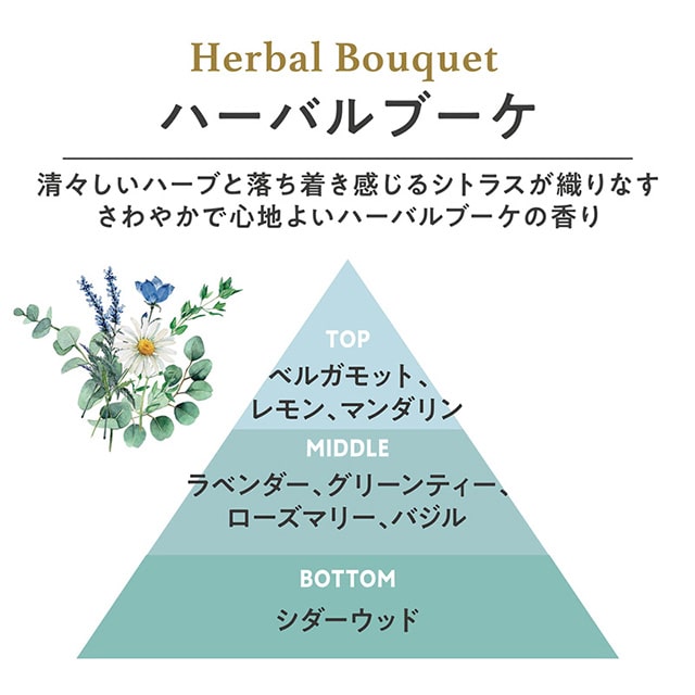 - 清々しいハーブと落ち着き感じるシトラスが織りなす、さわやかで心地よいハーバルブーケの香り