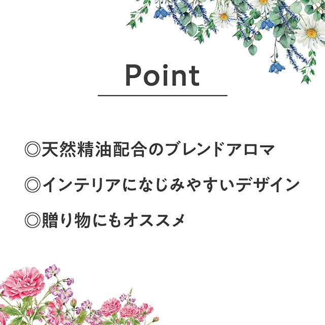 - 空間を心地よく。天然精油配合のブレンドアロマがやわらかく香り、お部屋を穏やかなリラックス空間に。やさしい印象のするガラスボトルとシンプルなスティックがインテリアになじみ、贈り物にもおすすめです。