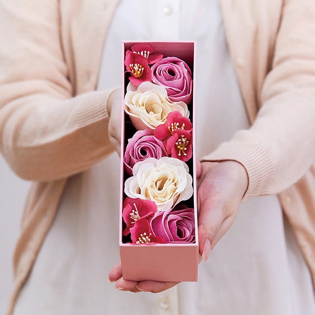 芳醇な花のアロマ香るバスフラワーを詰めた華やかバスギフト。使用するまで飾ってインテリアとしても楽しめます。