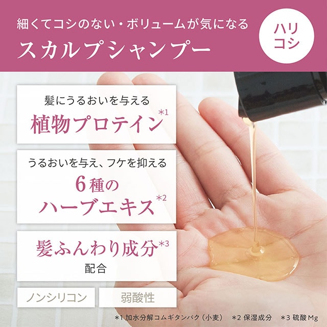 ハーブエキス(保湿成分)が細くコシの無い髪にうるおいを与え、頭皮環境を整えて健やかな髪に導くスカルプケアシャンプー。ノンシリコンシャンプー。