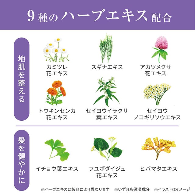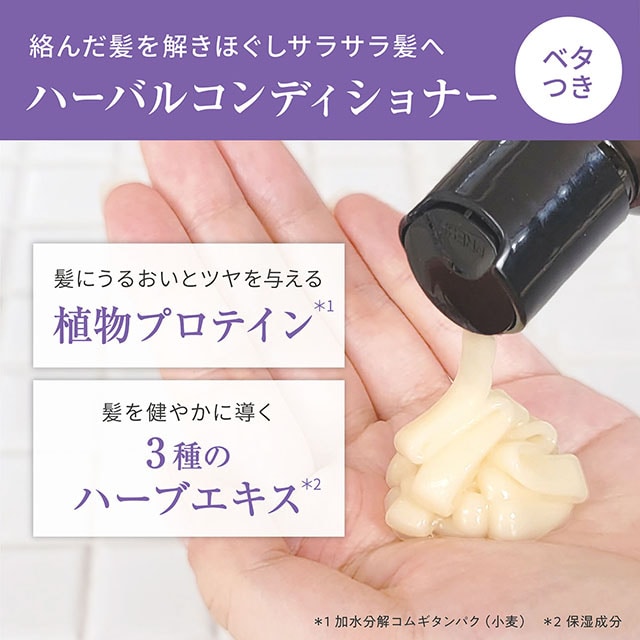 植物プロテインとハーブエキス(ともに保湿成分)がうるおいを与え、生き生きとしたツヤのある髪に。絡んだ髪を解きほぐしサラサラ感のある仕上がりに。