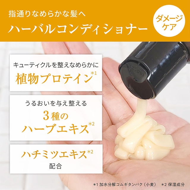 植物プロテインとハーブエキス(ともに保湿成分)が傷んだ髪にうるおいを与えてキューティクルをコーティング。シルクのようにしっとりとなめらかな指通りの髪に仕上げます。