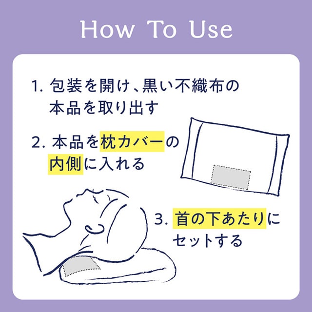 - ○包装を開けて中から黒い不織布の本品を取り出し、そのままご使用ください。○本品を枕カバーの内側に入れ、頭ではなく首の下あたりに来るようセットしてください。○香りは約2~3週間持続します。※持続期間はご使用される環境、使用方法によって異なります。○香料の性質上、本品の色味が変わる場合がありますが、ご使用に問題はありません。そのまま香りをお楽しみください。