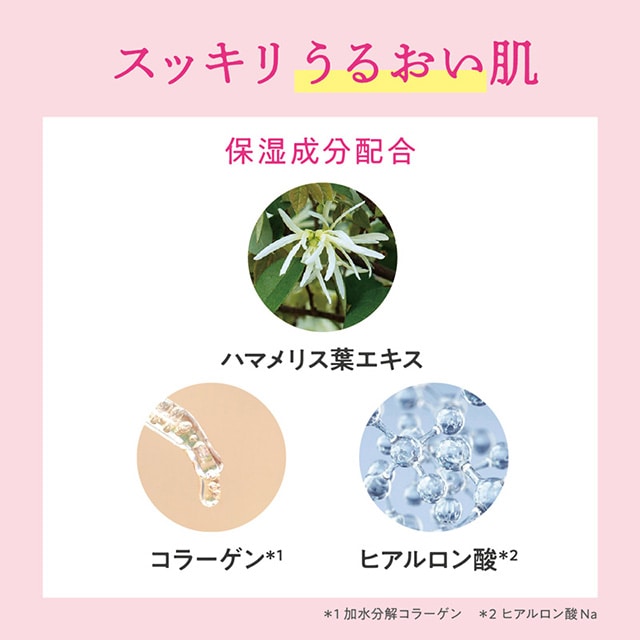 - 水、エタノール、タルク、シリカ、ヒアルロン酸Na、メチルパラベン、エチルパラベン、プロピルパラベン、PEG-60水添ヒマシ油、ハマメリス葉エキス、加水分解コラーゲ、 ユーカリ葉油、 クスノキ樹皮油、BG、EDTA-2Na、香料