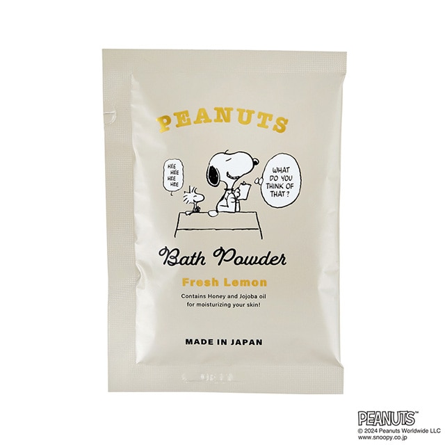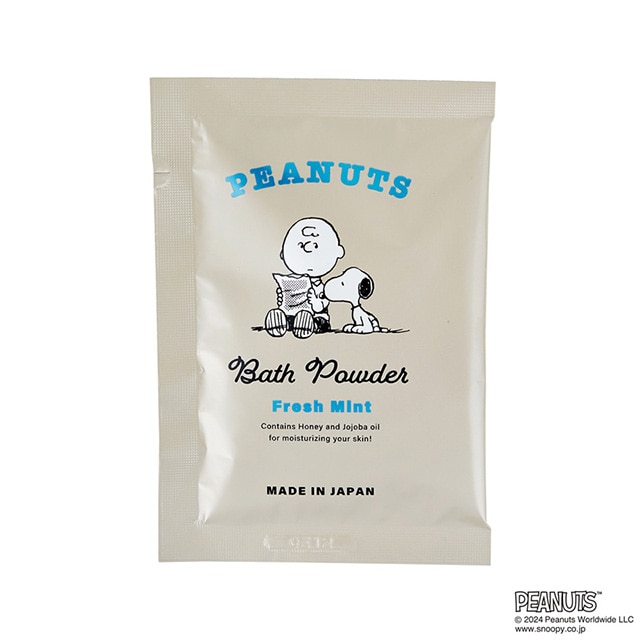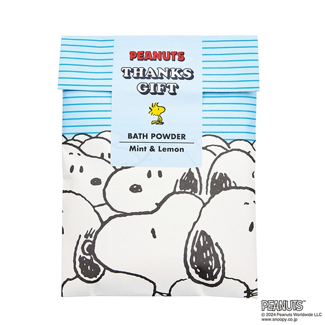 - たくさんのスヌーピーたちのアートのパッケージに包まれたバスパウダー2包セット。ちょっとしたお礼やお配りギフトにもおすすめ。
