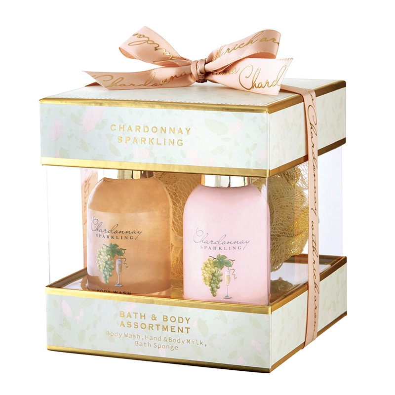 - 芳醇で軽やかなシャンパンのアロマを楽しめるボディーウォッシュとハンド&ボディーミルクのギフトセット。大切な人へ、至福のひとときの贈りものを。