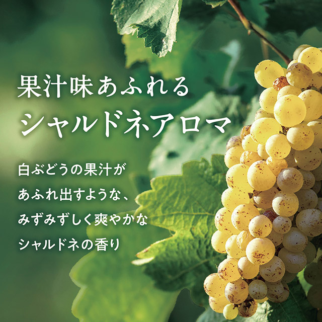 - 白ぶどうの果実があふれだすような、みずみずしく爽やかなシャルドネの香り