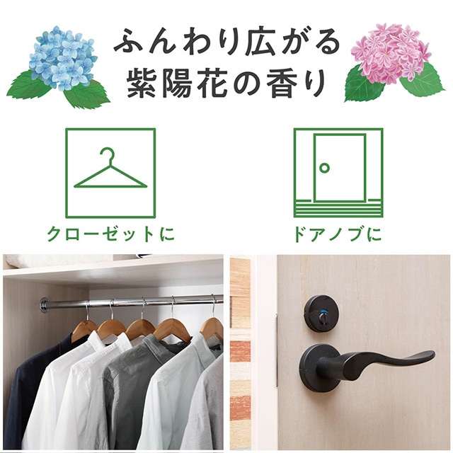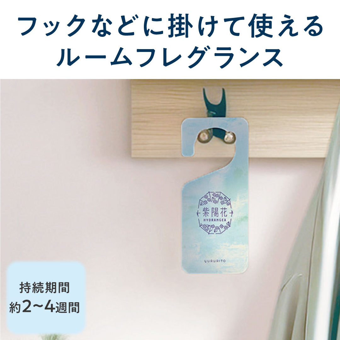 - ふんわり紫陽花の香りが広がる、ペーパータイプのエアフレッシュナー。クローゼットやドアノブなどお好みの小空間に掛けてお楽しみください。
