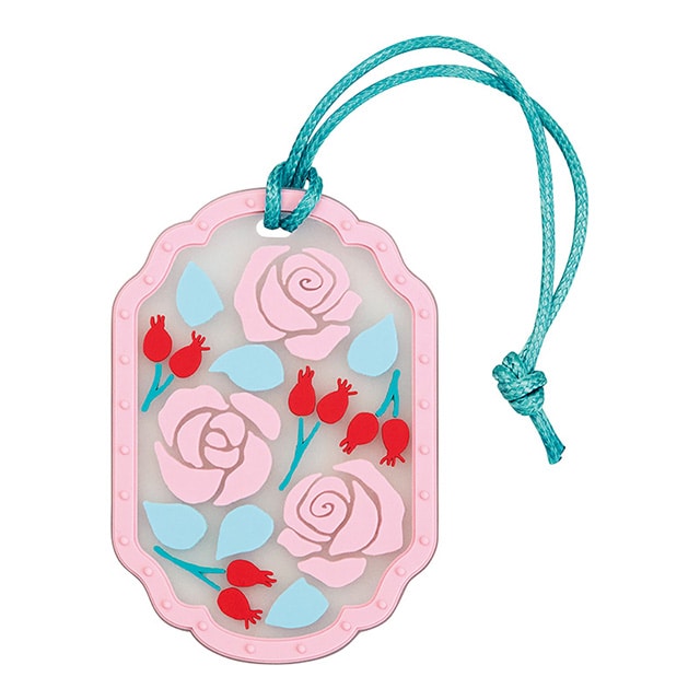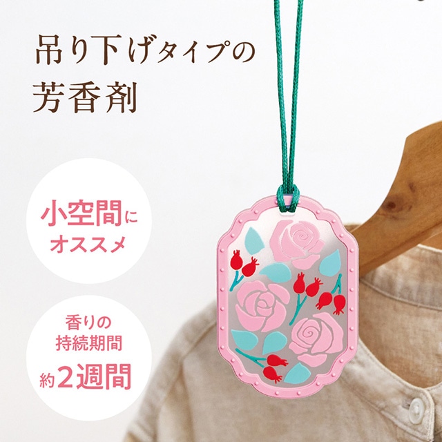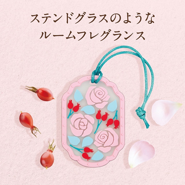ステンドグラスをイメージした装飾が美しい吊り下げタイプの芳香剤。バラの実と花の香りがふんわり広がります。