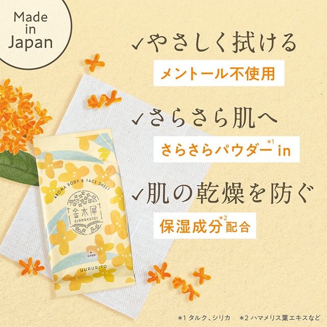 - 1枚でからだも顔も拭ける金木犀が香るボディー&フェイスシート。汗・皮脂を吸着するサラサラパウダー*配合。やわらかな厚手シートで、汗やベタつき、気になるニオイをしっかり拭きとります。 メントール不使用のやさしい使い心地だから親子でもお使いいただけます。