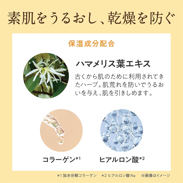 - 水、エタノール、タルク、シリカ、ヒアルロン酸Na、メチルパラベン、エチルパラベン、プロピルパラベン、PEG-60水添ヒマシ油、ハマメリス葉エキス、加水分解コラーゲン、BG、EDTA-2Na、香料