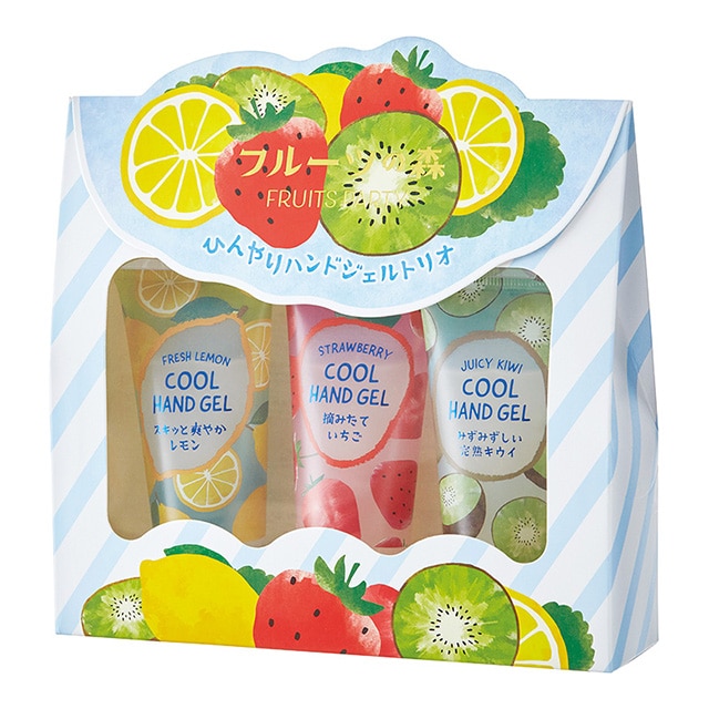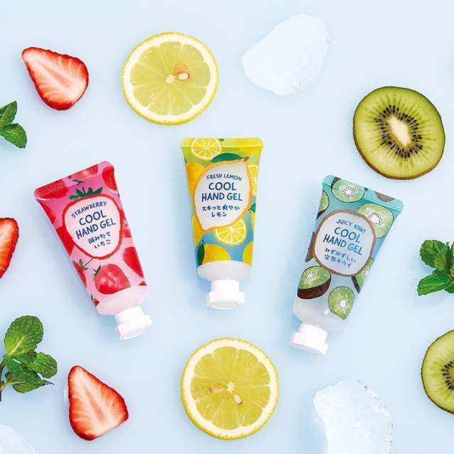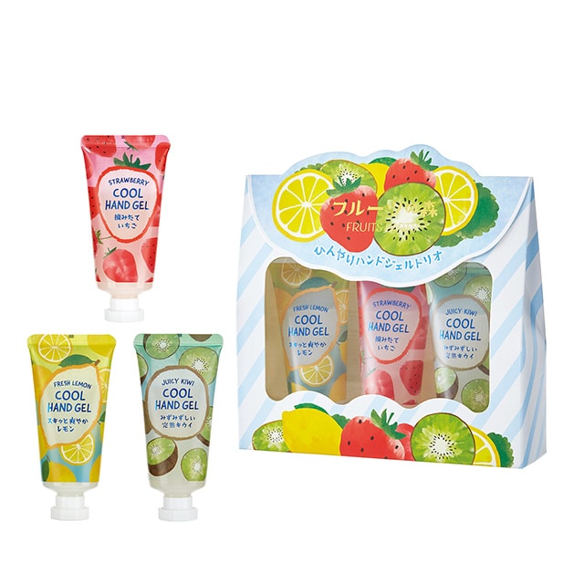 - 爽やかなフルーツの香りとひんやりソルベで手肌を涼しく楽しくうるおす「ひんやりハンドジェル」の3本セット。