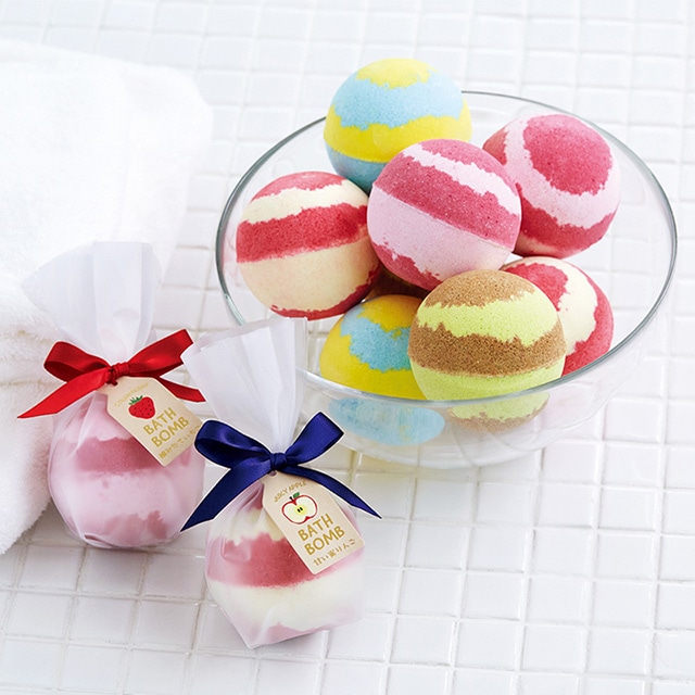 - お風呂に入れた瞬間、はじけるように溶け出すハンドメイドの発泡バスボム。勢いよくはじけるマーブル模様とおいしそうなフルーツの香りが楽しめます。肌をうるおすフルーツエキス配合。楽しい風呂時間を贈るギフトにもオススメ。