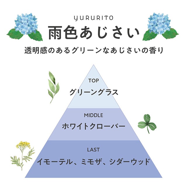 - 紫陽花の風情感じる彩りと透明感のある香りで季節を楽しむルームフレグランス。使いやすいコンパクトなサイズで玄関や洗面所、ベッドサイドに。
