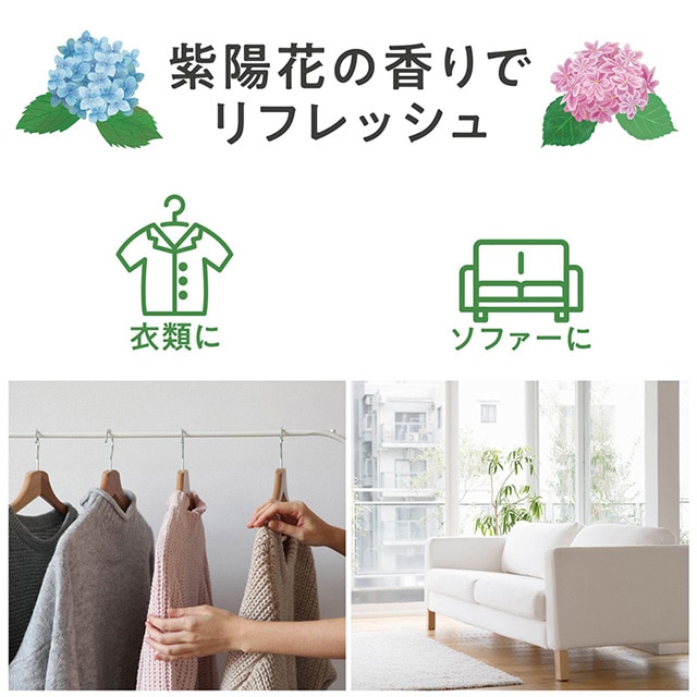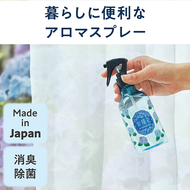 - 透明感のあるグリーンな香りが広がる紫陽花のアロマミスト。毎日の暮らしに便利な消臭・除菌*機能付きで、衣類やカーテンなどの布製品や室内空間に。