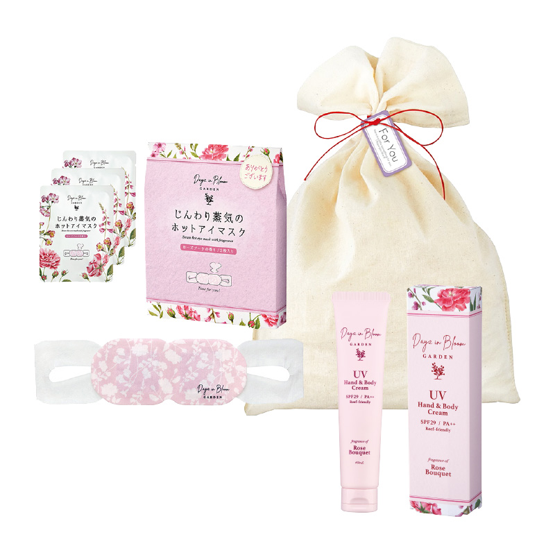 - 頑張った目元をじんわり温める「ホットアイマスク」と、日常の紫外線から肌を守りながら潤す「UVハンド&ボディクリーム」のセット。