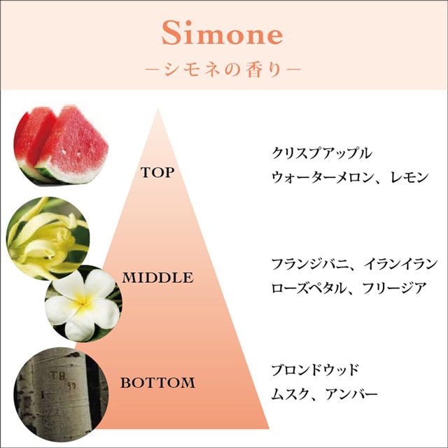 シモネは女性らしくはありますが、フルーティーフローラルで使いやすく、ウォーターメロンが夏にぴったりなので暑くなりはじめるとよく使っています。