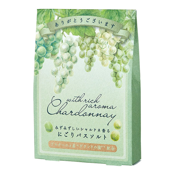 白ぶどう果汁があふれだすようなみずみずしく爽やかなシャルドネの香り。フランス・ブルターニュ産海塩“ゲランドの塩*1”を配合した贅沢な大粒バスソルト。こだわりの保湿成分配合で、肌にうるおいを与えながら安らぎのにごり湯を楽しめます。 *1海塩、*2乳酸桿菌/ブドウ果汁発酵液、*3アルガニアスピノサ核油